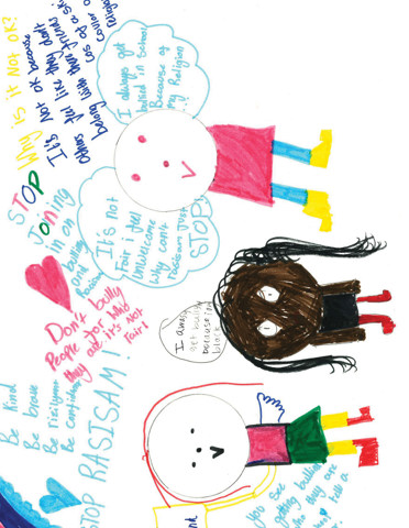 The artwork resulted from a series of workshops that the children took part in with Children First, exploring how racism has impacted them, their school and wider community. Working together the children created characters to bring to life the traits and behaviours they would want to see in an anti-racist ally.